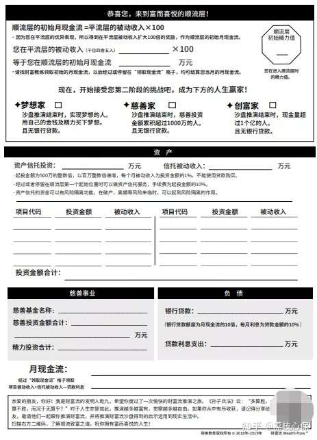 怎么样才能够赢?首先你想赢的话,必须先进入顺流层,进入顺流要把你这财富报表右上角那句话圈起来:努力使你的被动收入超过总支出。所以你看你被动收入是多少,必须要超过总支出,才有可能进入顺流,才有可能实现梦想。所以各位这就是我们进入顺流的关键点。