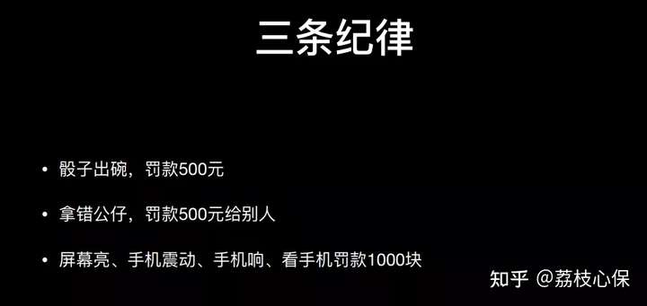 第一条:骰子跳出碗,罚款500块。第二条:拿错谁的公仔,就给500块。第三条:手机响,手机振动,屏幕亮或者看手机,罚款1000块。