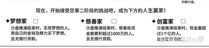 沙盘推演是有时间限制的,有90/105/115分钟三个版本。除财富教练外,参与玩家人数一般4-6人。推演开始的时候,玩家都是20岁,在时间推进的过程中,会听到钟声连续响三下,这时所有人都要保持静默,这代表着五年时间过去了。这个时候财富教练会说:5年又过去了,大家一起说:时间过的真快呀,一眨眼已经XX岁了。玩家要争取在60岁钟声响起前进入顺流层,努力成为人生赢家。