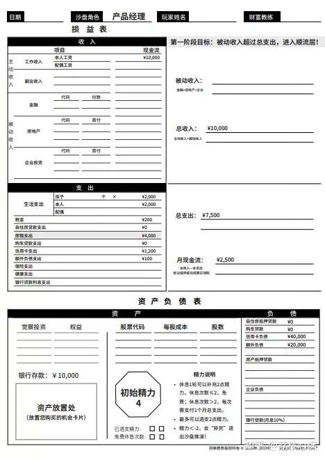 所有玩家找财富教练抽取一张财务报表,上面会有你的职业、收入、支出情况。财务报表分为三个区域,最下面叫资产负债表,记录你的资产和负债情况;报表左上角部分叫损益表,记录每个月固定收入和支出;报表右上部分是现金流量表,记录你的总收入和总支出。月现金流就是每个月剩下的钱,用月总收入减去月总支出。在沙盘推演中,每个月你能领取的钱就是这个月的现金流。